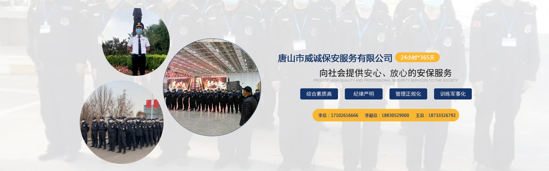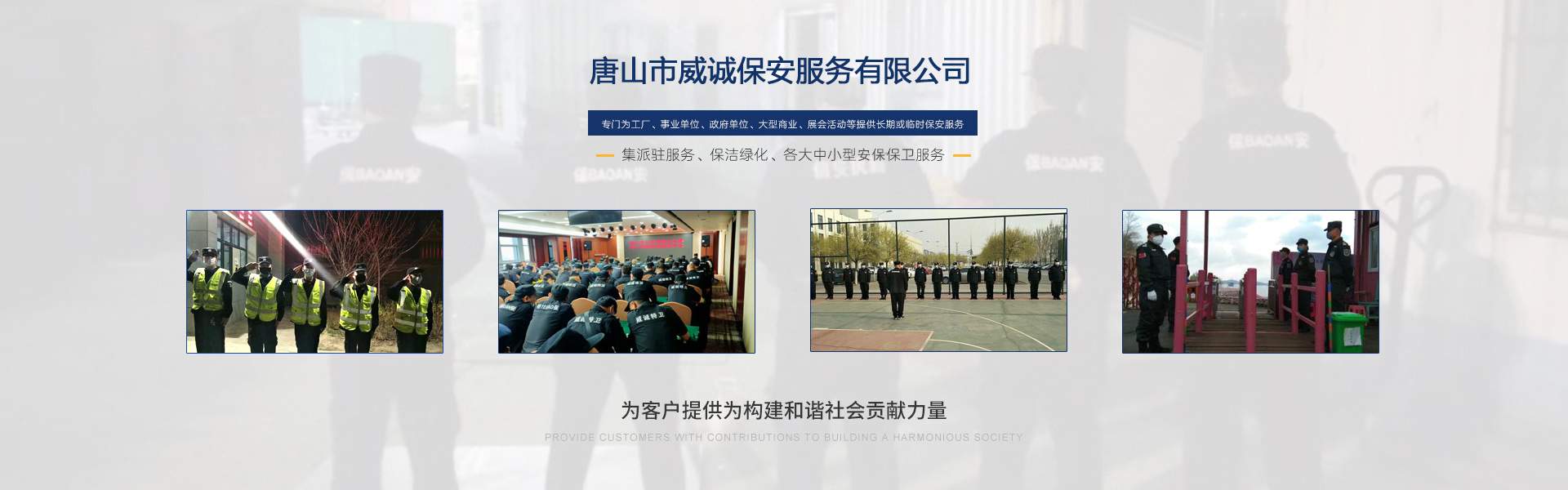 唐山市威誠保安服務(wù)有限公司自成立以來以“嚴(yán)防死守、忠于業(yè)主”為服務(wù)原則,以“客戶滿意、 合作共贏”為根本目標(biāo)。以科學(xué)的管理、多方位多層次的服務(wù),建立了首問責(zé)任制,完善了走訪、回訪 、滿意度調(diào)查、末位淘汰的預(yù)警管理,不斷提高服務(wù)質(zhì)量,提高業(yè)主滿意度,提高企業(yè)形象。秉承“誠 實守信,紀(jì)律嚴(yán)明,團(tuán)結(jié)協(xié)作,致精致誠”的服務(wù)理念,為客戶提供高品質(zhì)、多方位、專業(yè)化的保安服務(wù)。 本公司制定了嚴(yán)謹(jǐn)?shù)亩ㄏ蛘猩徢芭嘤?xùn)、考核錄用、崗中培訓(xùn)、持續(xù)培訓(xùn)、末位淘汰制等一整套完善的管理體系??梢愿鶕?jù)客戶的要求實地勘察評估,以量身定做的方式提供安保防范服務(wù)。